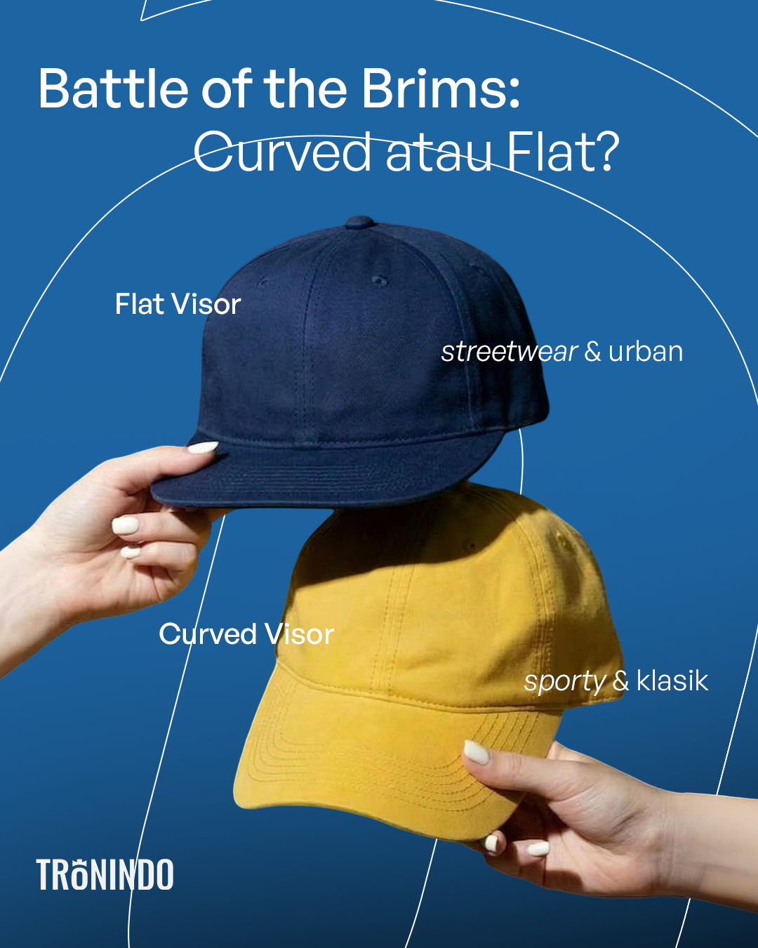 Dalam industri headwear, perdebatan antara lidah topi melengkung (Curved) dan datar (Flat) adalah “perang” klasik yang tidak pernah usai. Keduanya memiliki basis massa yang fanatik. Sebagai pemilik brand, pilihan ini bukan sekadar soal selera pribadi, tapi soal memahami siapa audiens Anda dan pesan apa yang ingin disampaikan. Di Tronindo, kami tidak memihak salah satu—tugas kami adalah memastikan apapun pilihan Anda, hasilnya presisi secara teknis dan komersial.